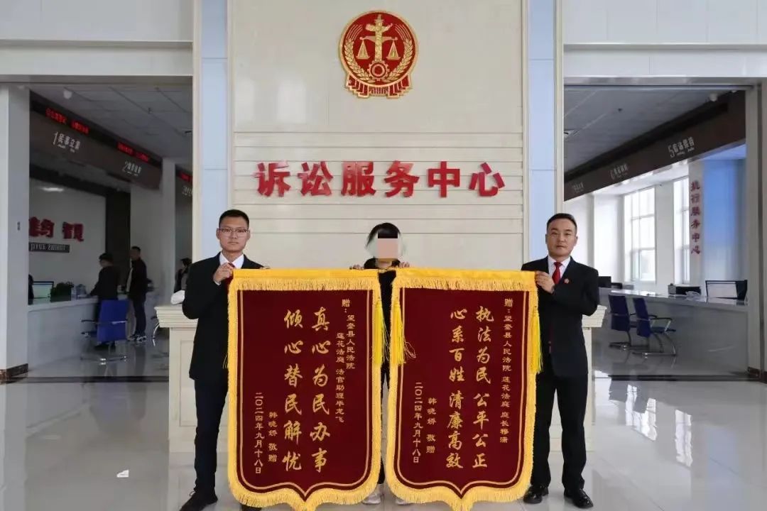 当事人韩某亲手将二面锦旗送到望奎县人民法院,语言中饱含对法院工作人员的感激之情,更对莲花法庭工作人员穆潇、毕龙飞有温度、高效率的工作赞不绝口。