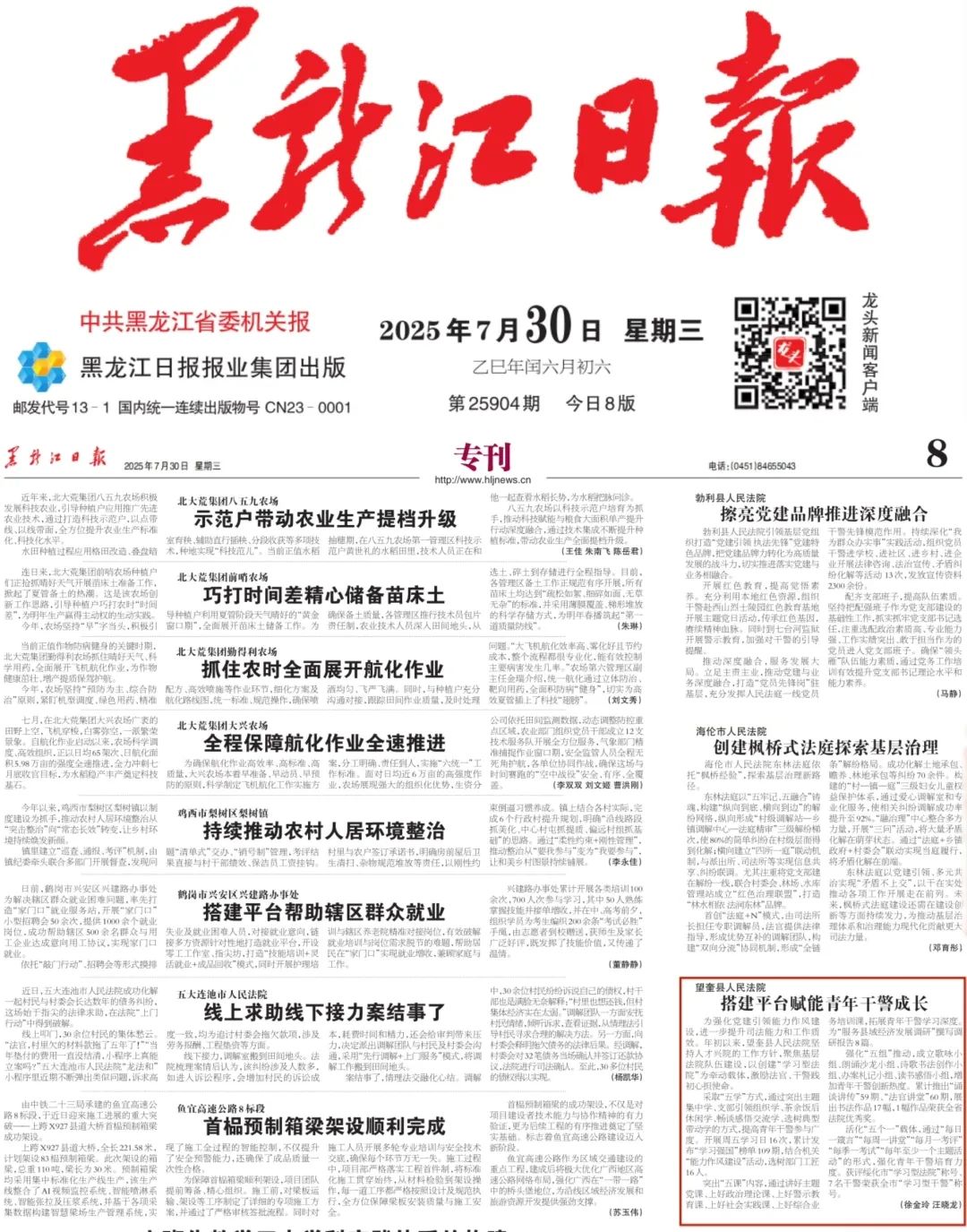 7月30日,黑龙江日报第8版报道望奎法院助力青年干警成长工作做法。