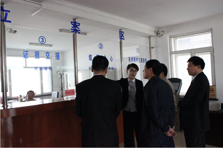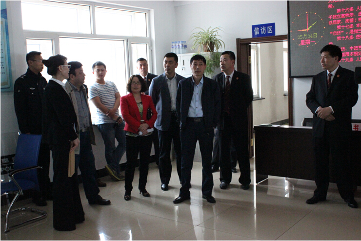 中院党组成员张迪(左一女)及县人大副主任姜久志(右三)等视察立案登记工作